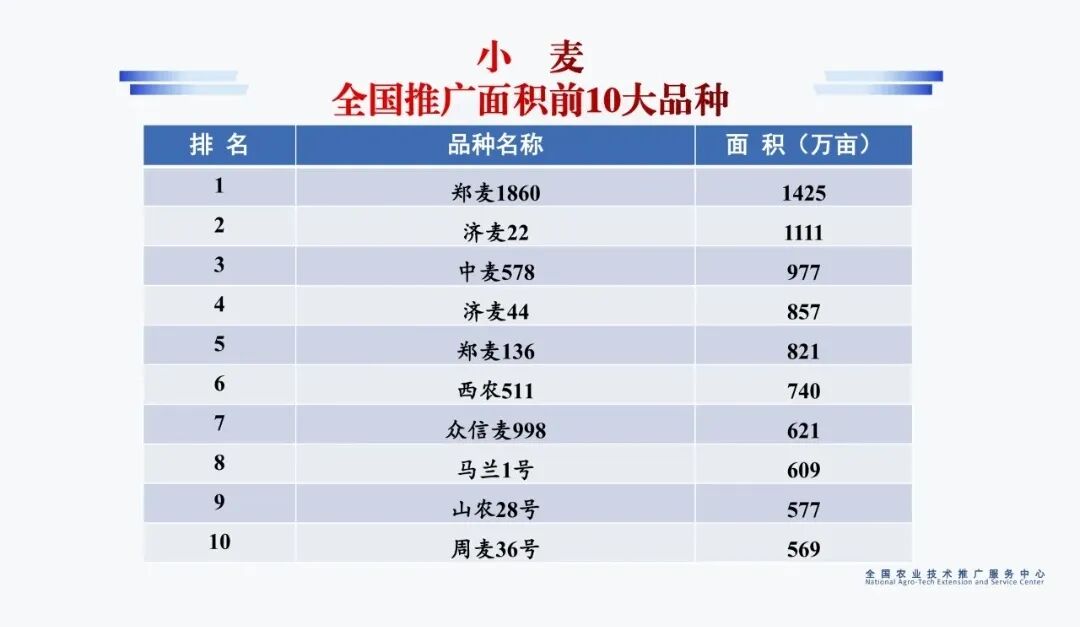 ● 小麦全国推广面积前十大品种:公司中麦578相比去年再次跻身一位名列全国第三。