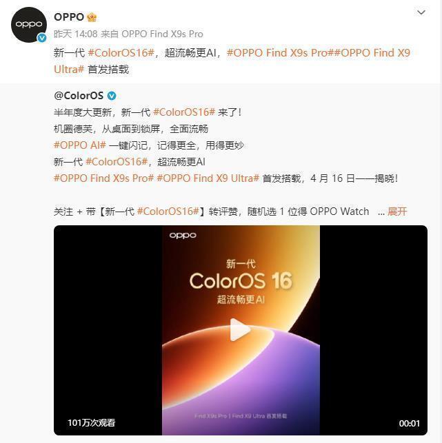 日前, @ColorOS 发布了一段官宣预热视频,并配文称,“半年度大更新,新一代 #ColorOS16# 来了!